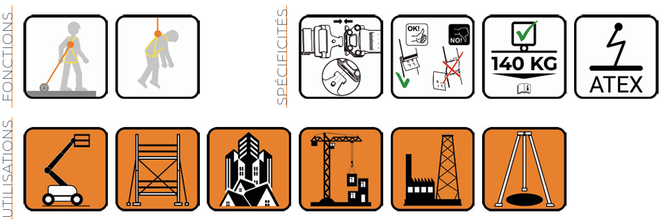 Enfilage et réglage rapide grâce aux boucles automatiques FAST UP au niveau des cuisses. Sous-fessière de maintien. Sangles haute visibilité jaune fluorescent avec inserts réfléchissants. Étiquettes d’informations et de traçabilité protégées. Témoins de chute intégrés. Fermeture assurée par sangle sternale réglable. Passant porte-matériel aux extrémités de la bavaroise. Testé et approuvé 140 kg, antistatique (ATEX).